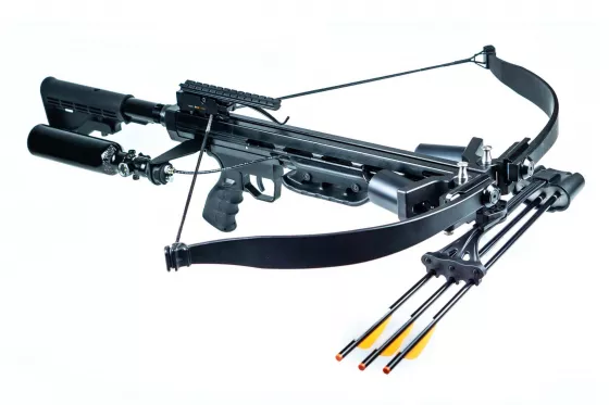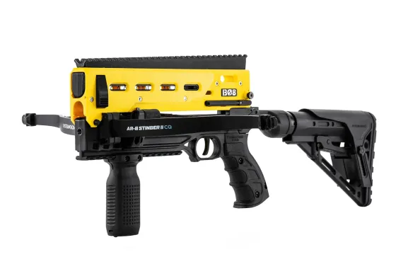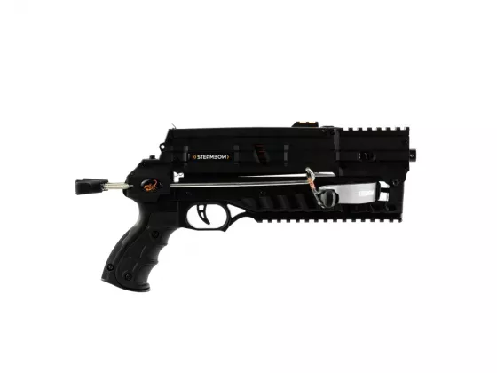 Die Steambow AR-6 Stinger II Tactical ist eine Repetierpisto­lenarmbrust mit einem 6-Bolzen-Magazin und einem Zuggewicht von 55 Pfund. Es kommt mit einem klappbaren AR-15 Hinterschaft und einem taktischen Vordergriff ausgestattet.