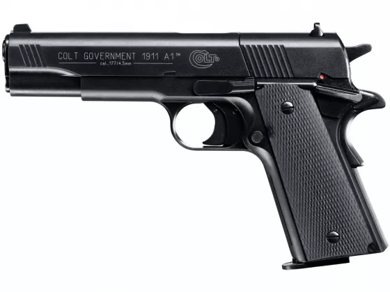 Gut gemachte Replik des legendären Colt Government 1911. Der Vorteil ist seine Vollmetallkon­struktion und gut gemacht Kunststoffgriff. 8 Runden Magazin für Bleikugeln.