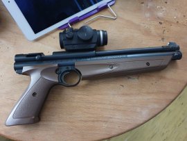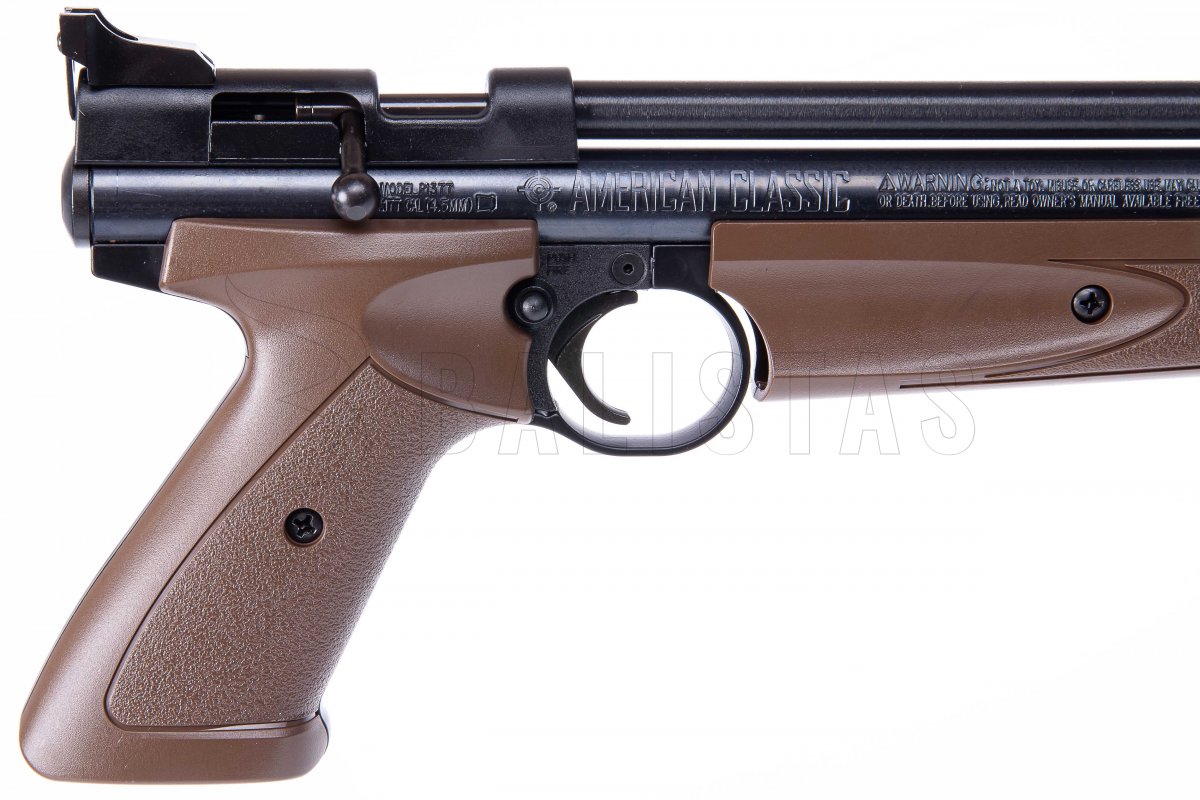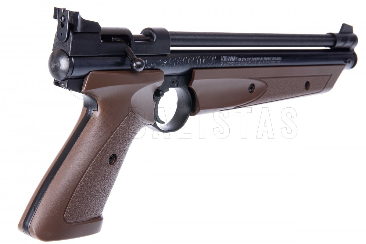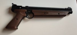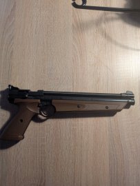 Eine kurze einschüssige Luftpistole Crosman 1377 mit patentiertem Pumpsystem. Dank gerilltem Lauf und Antrieb durch Druckluft ist sie sehr zielgenau.