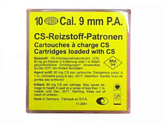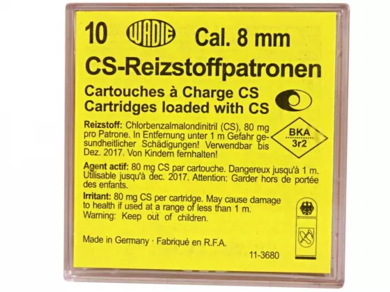 Platzpatrone CS für Schreckschusspis­tolen des Kalibers 9mm mit Reizstoff zur persönlichen Verteidigung. Enthält neuro-paralysierendes Gas (CS-chlorbenzalmlon­dinitril) in einer Menge von 80 mg / Patrone