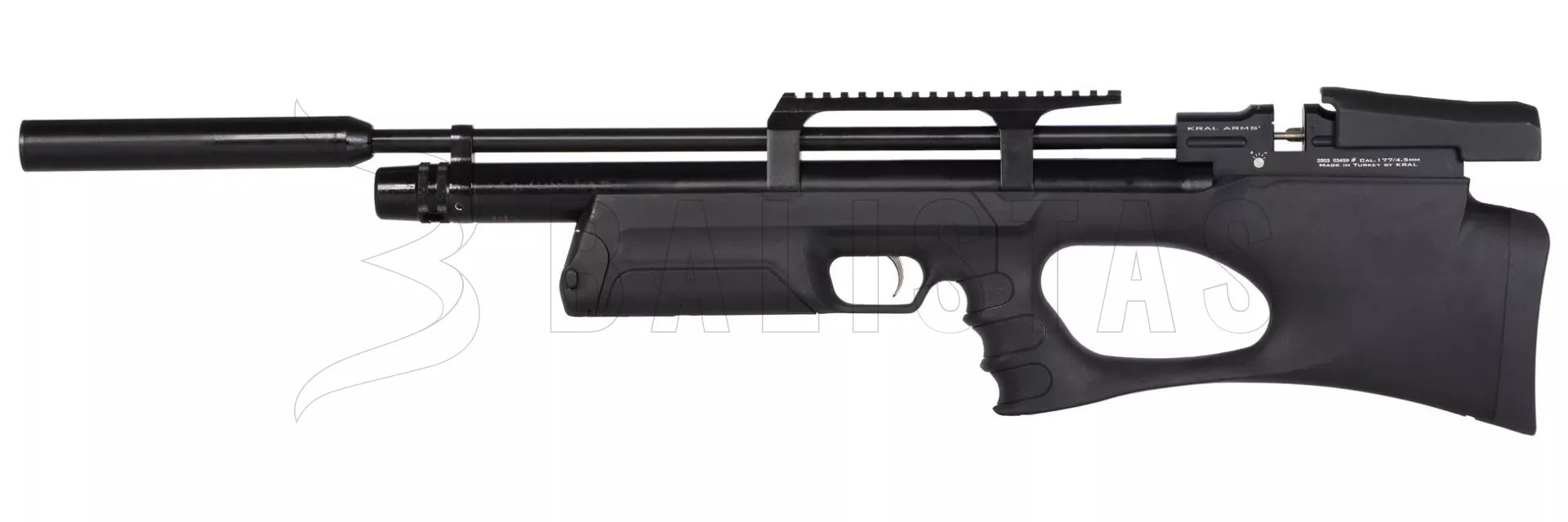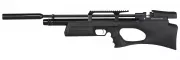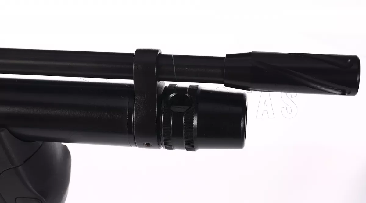 Der Lufttank erstreckt sich fast über die gesamte Länge des Laufes und kann daher bis zu 280 cc Luft aufnehmen. Der maximale Arbeitsdruck beim Schießen beträgt 200 bar und mit einem vollen 200Bar Lufttank hat man ca. 80 Schuss (von 200 auf 120 BAR). Die Befüllung erfolgt über eine Quickfill-Sonde. Der Lauf erreicht eine Länge von 53,5cm und endet mit einer Kappe, die auf ein 1/2 UNF Gewinde geschraubt wird, so dass es möglich ist, den externen Schalldämpfer zu verwenden, der im Paket enthalten ist. Magazine arbeiten nach dem Prinzip einer vorgespannten Feder, so dass es keinen weiteren Mechanismus gibt, der den Trichter drehen würde. Dieser Typ wird auch von Evanix, Daystate, Vulcan und anderen verwendet.