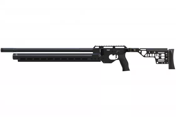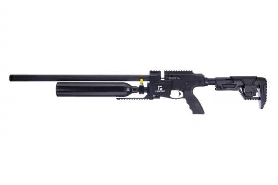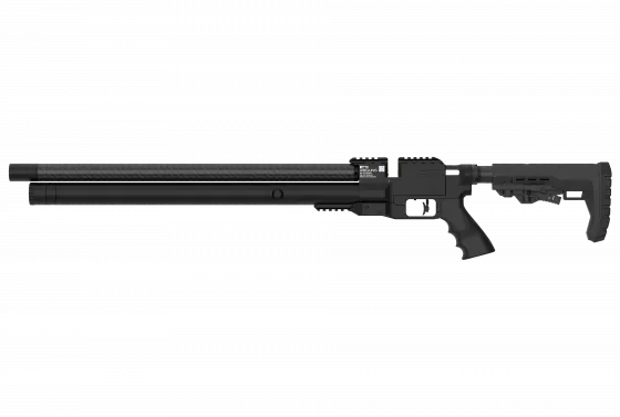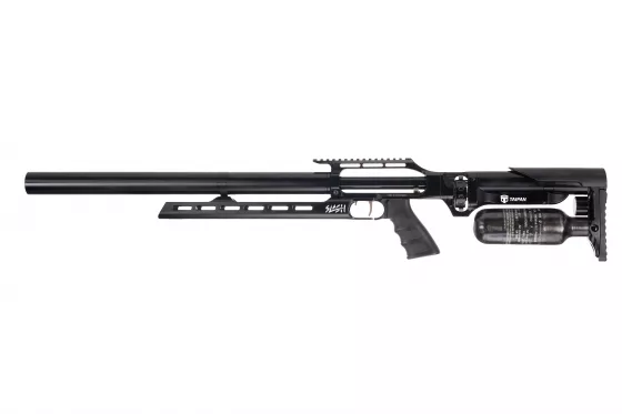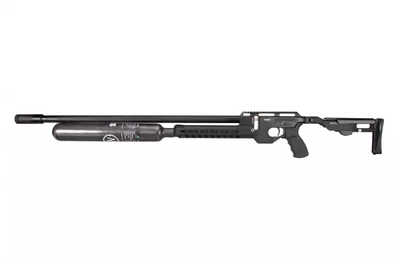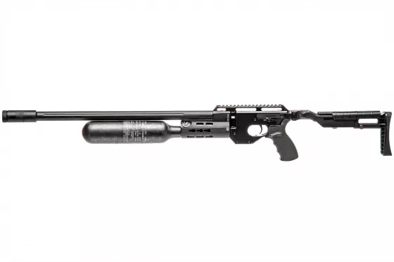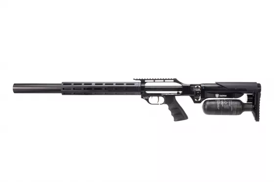 AirMaks Katran ist ein leichtes PCP-Luftgewehr mit klappbarem Aluminiumschaft. Dieses Modell ist mit einer 480 cc Kevlar-Luftflasche ausgestattet. Der KeyMod Vorderschaft ist direkt an der Trommel befestigt. Das Magazin hat eine Kapazität von vierzehn Kaliber .25 Kugeln.