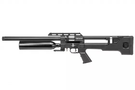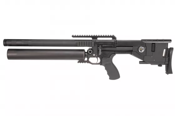 Semi-Auto Luftgewehr mit einem revolutionären Ventil, das eine hervorragende Leistung bei minimalem Luftverbrauch bietet. Darüber hinaus verfügt es über ein sehr kompaktes und dennoch robustes Design, einen punktgenauen Mantel-Lauf mit integriertem Schallmoderator, einen AR-15-Griff und eine 20 MOA geneigte Picatinny-Schiene.
