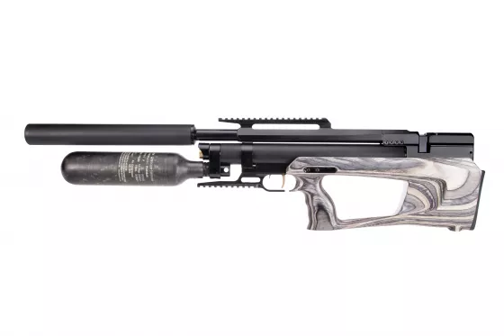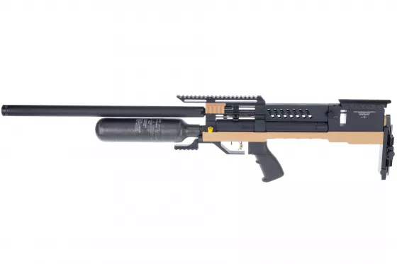 Die einzigartigste Variante der leistungsstarken tschechischen Bockbüchsflinte mit einem prächtigen Laminatschaft, 700mm langem Lauf, 580cc Kevlar-Patrone mit 300 bar Arbeitsdruck, extern einstellbarem Druckregler, 60cc Powerplenum und austauschbarem Ladehebel.