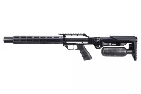 Die neue „taktische“ Version des Taipan Veteran II Gewehrs richtet sich an Kunden, die einen moderneren und taktischen Look bevorzugen und etwas Unorthodoxes wollen. Die Taipan Veteran II Tactical ist mit einer 480 ccm Kevlarflasche für ein erhöhtes Luftvolumen ausgestattet. Der frei schwimmende Lauf ist vollständig ummantelt und hat einen verlängerten Schallmoderator.