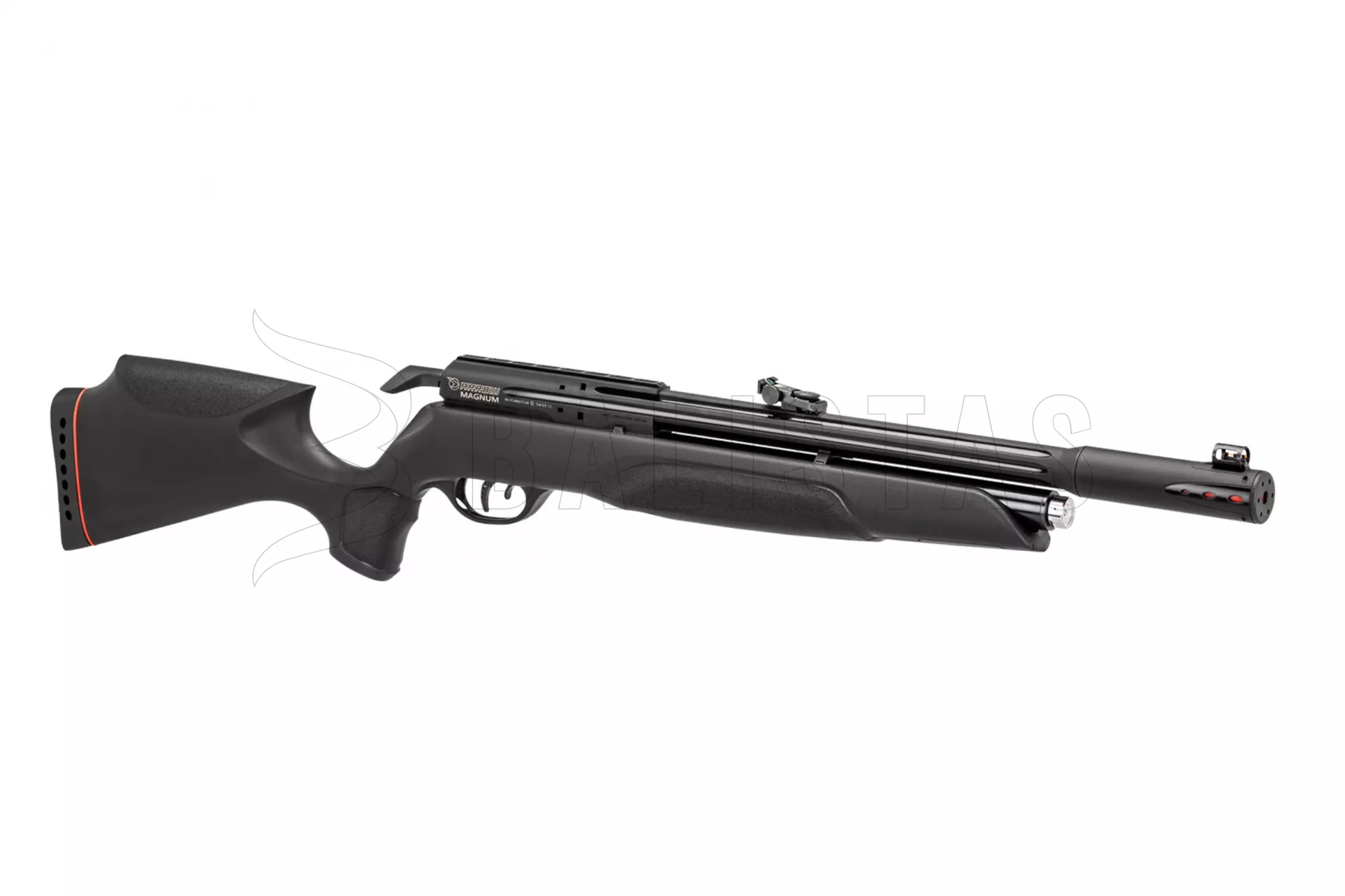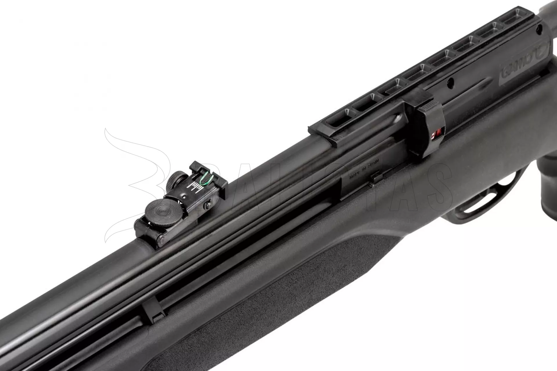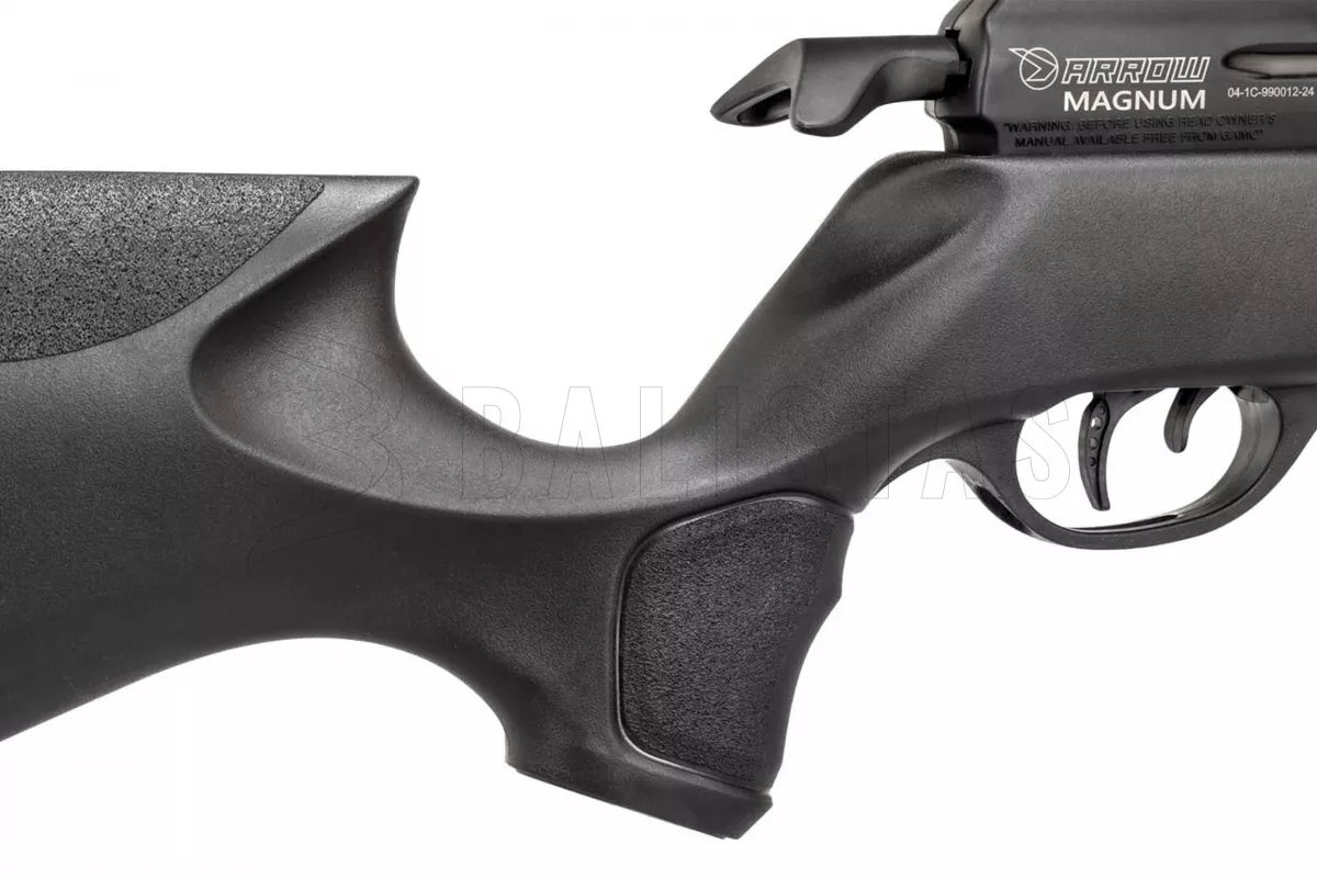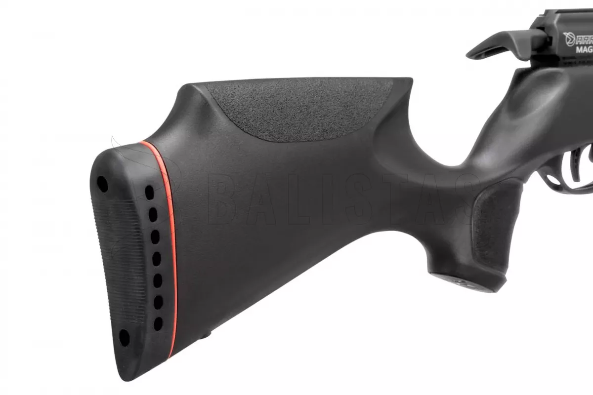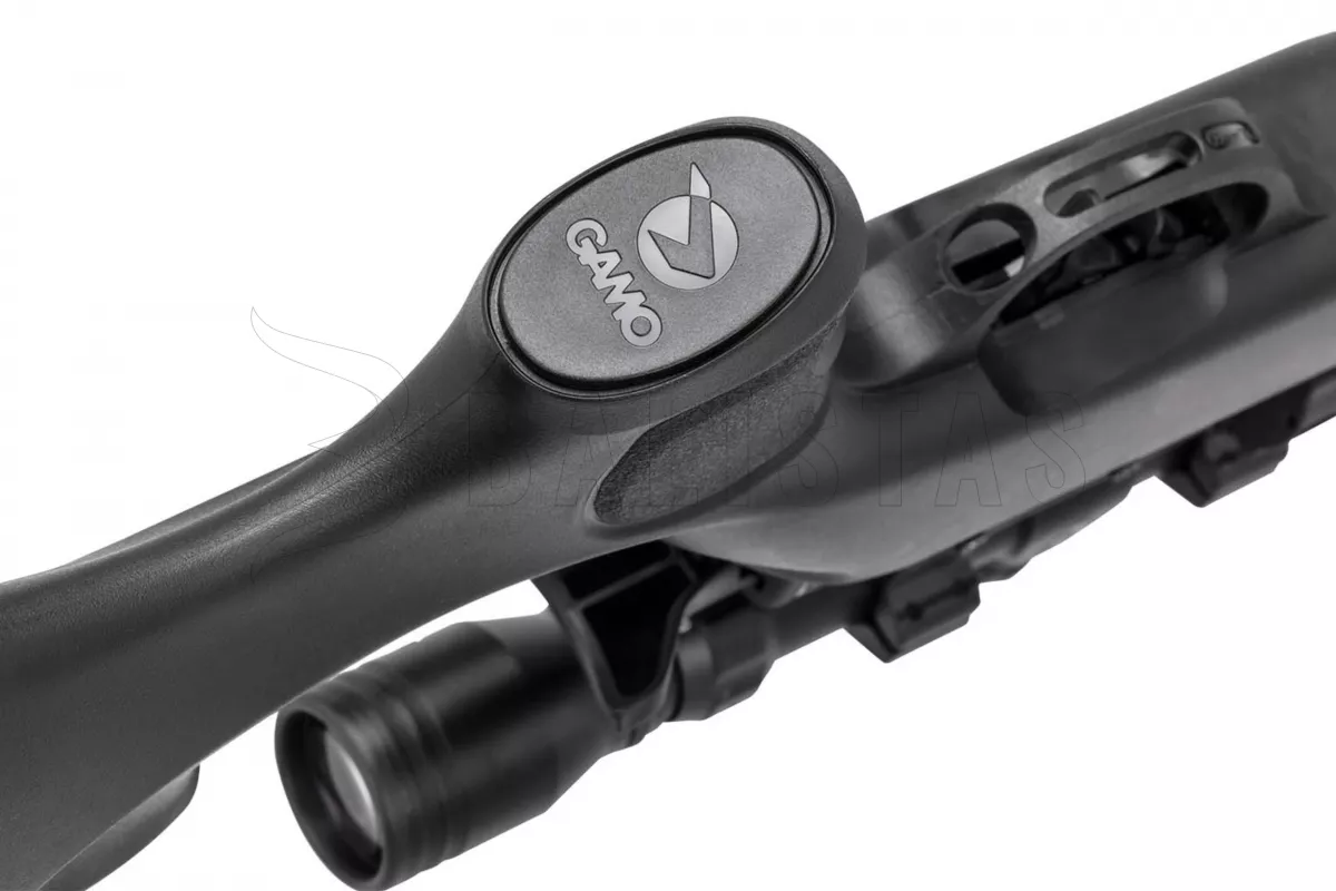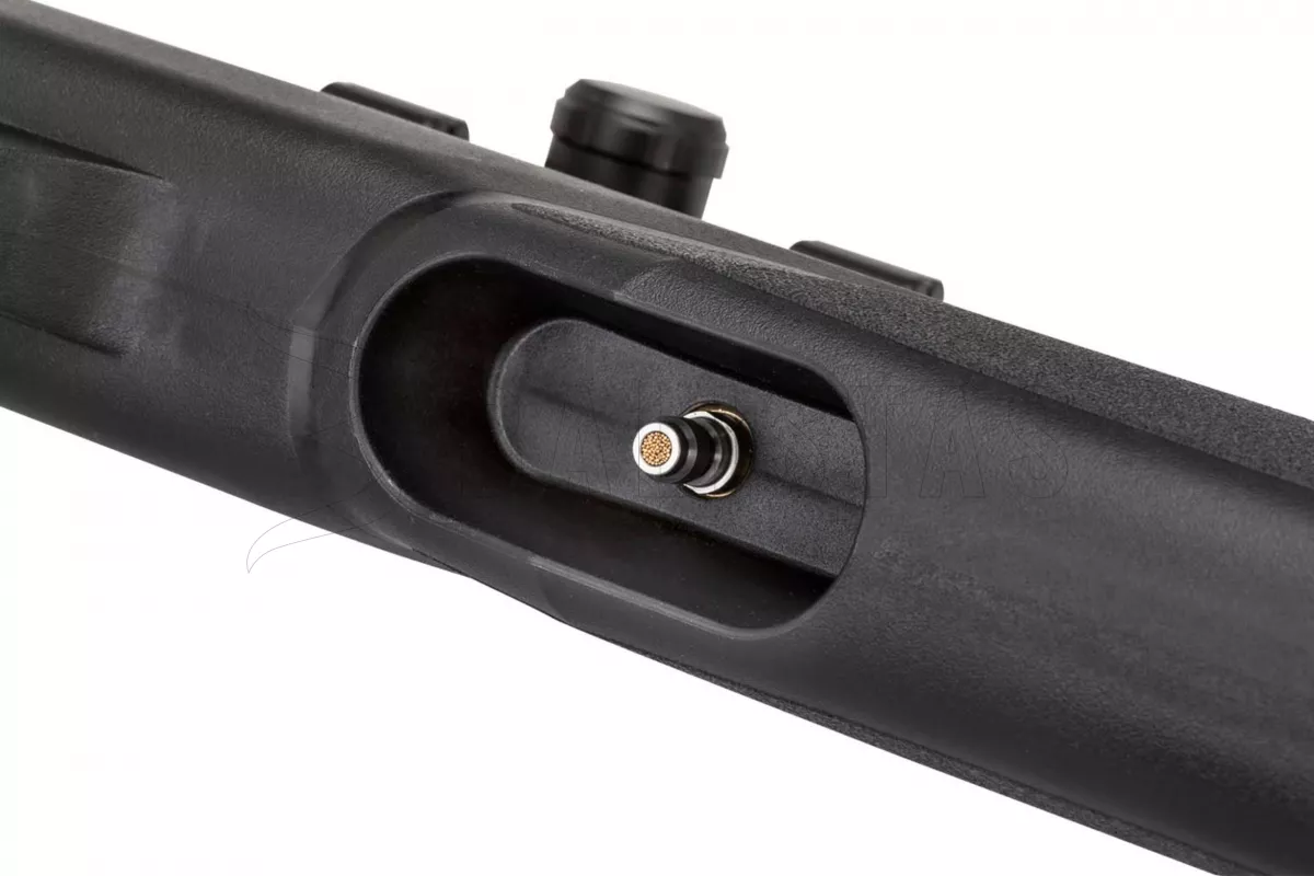 Gamo Arrow wird Sie durch sein geringes Gewicht überraschen, das 2,3 kg nicht überschreitet. Dieses Gewicht wurde vor allem durch die Verwendung eines leichten und ergonomisch geformten Kunststoffschaftes mit einer doppelseitigen Backe und einem Gummischuh zur Dämpfung des Rückstoßes erreicht. Der Lauf ist ummantelt und die Mündung ist mit einem Whisper Fusion Geräuschmoderator ausgestattet.