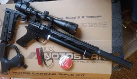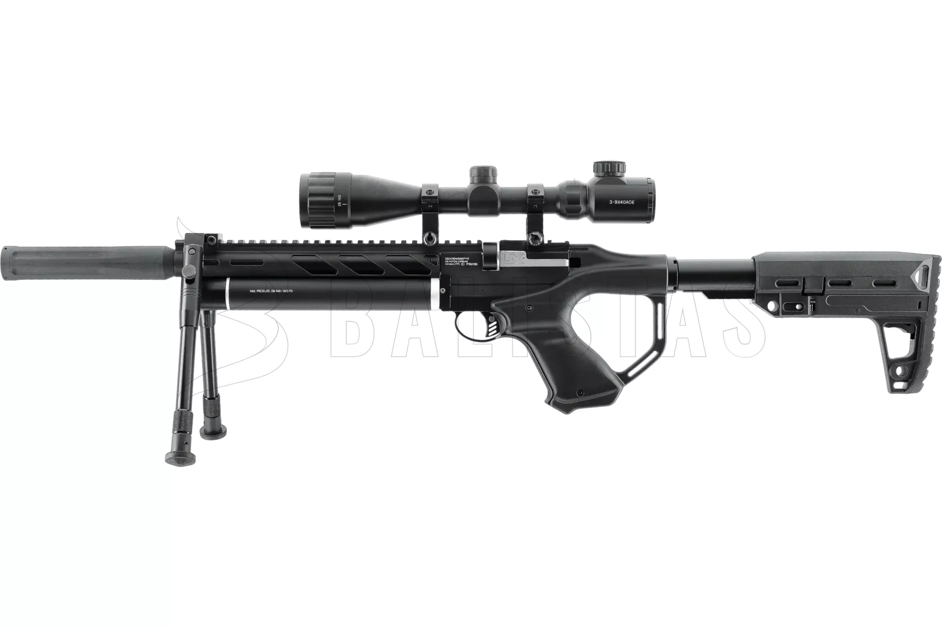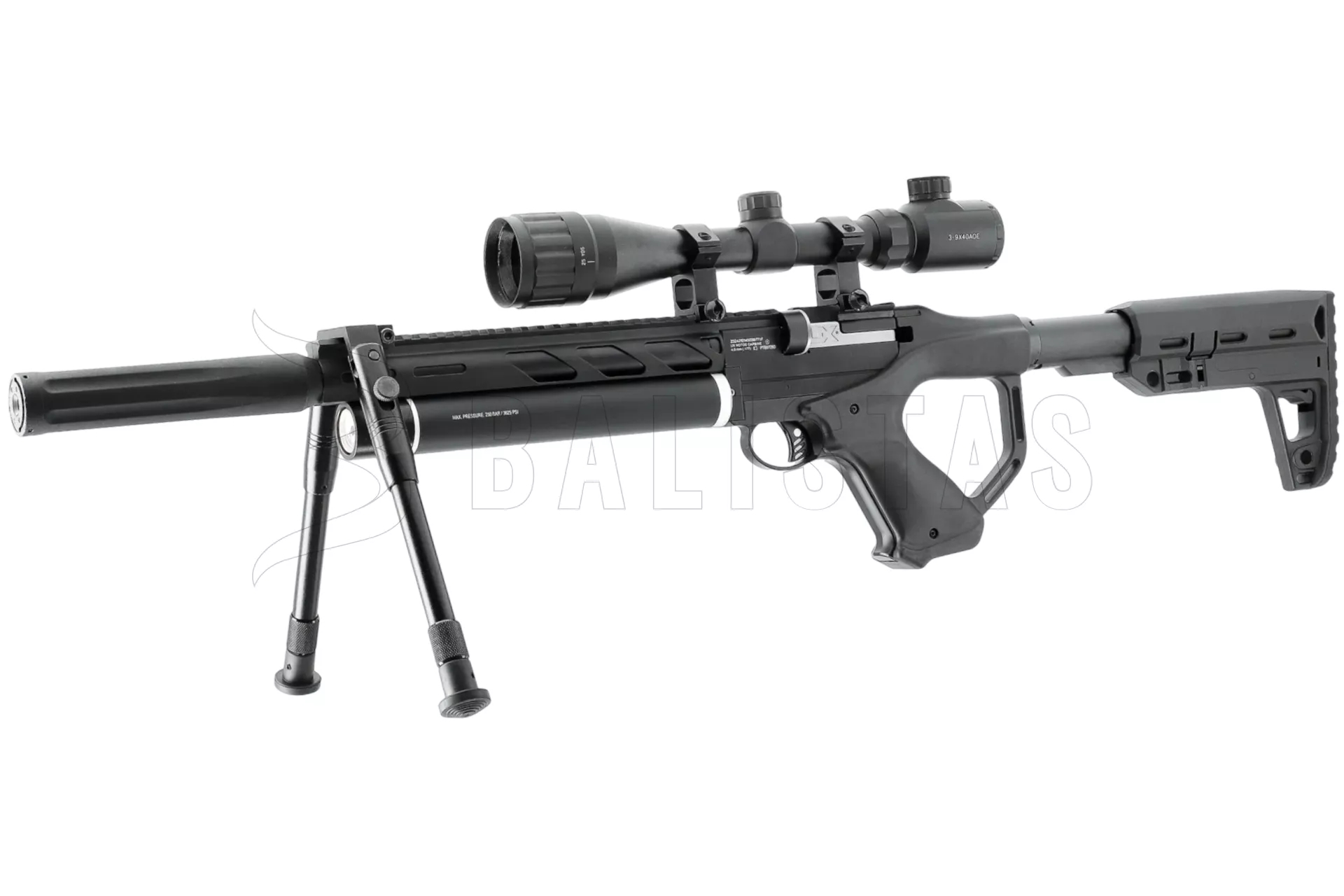 Zum Luftgewehr gehört außerdem ein Zielfernrohr mit variabler Vergrößerung 3-9x40 mit beleuchtetem Fadenkreuz in Rot und Grün sowie mit einstellbarer Parallaxe. Ebenfalls im Lieferumfang enthalten ist ein abnehmbares Zweibein/Bipod mit teleskopischen Beinen in insgesamt 3 wählbaren Positionen (0°, 90°, 180°). Der Schaft ist ebenfalls längenverstellbar, wodurch die Gesamtlänge des Luftgewehrs 800-865 mm beträgt.