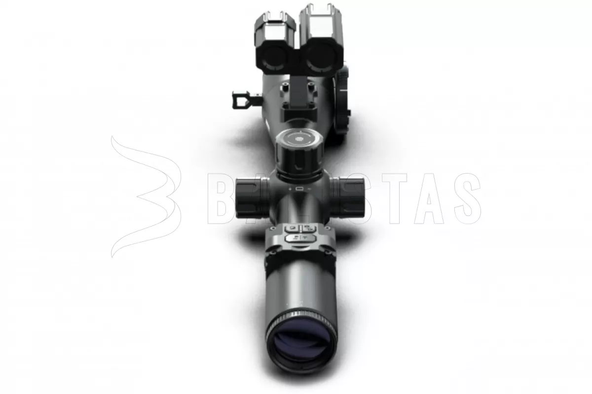 Der hochpräzise Laserentfernungsmesser funktioniert bis zu 1000m und ist mit einem integrierten Ballistikrechner gekoppelt, der die Flugbahn des Geschosses bestimmt und dessen Auftreffpunkt auf dem Bildschirm anzeigt.