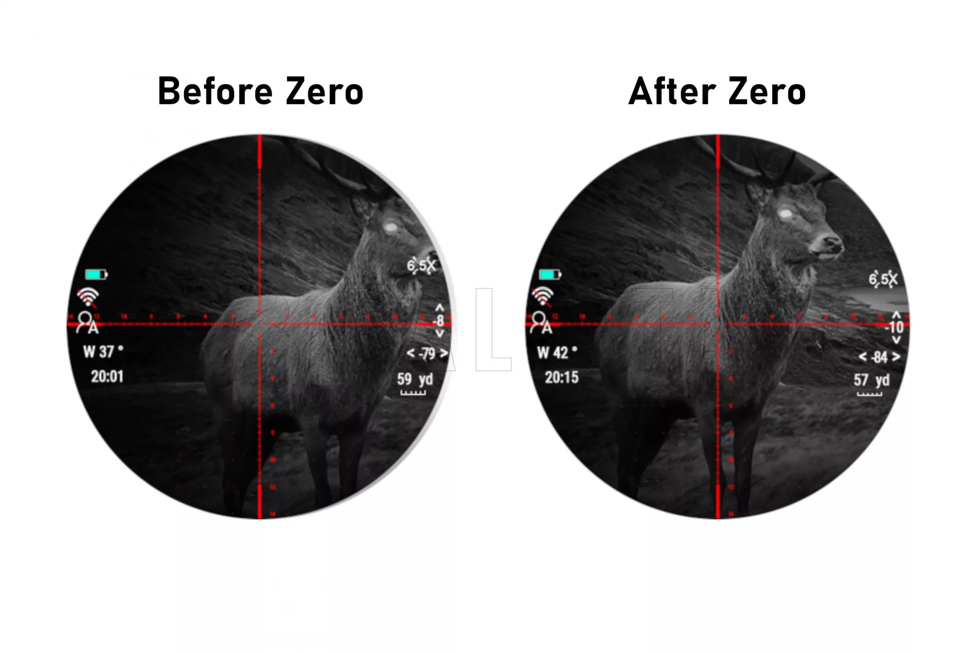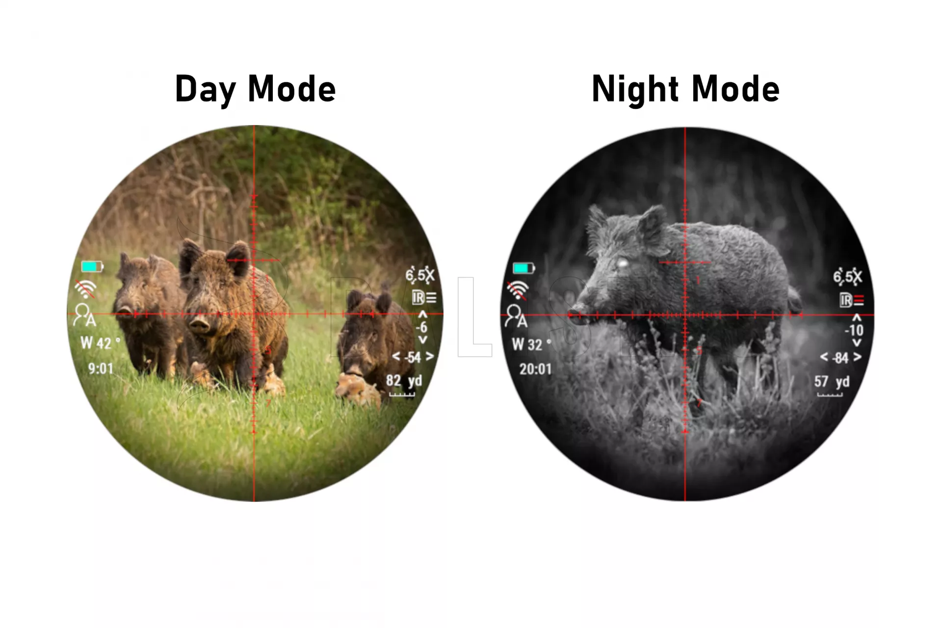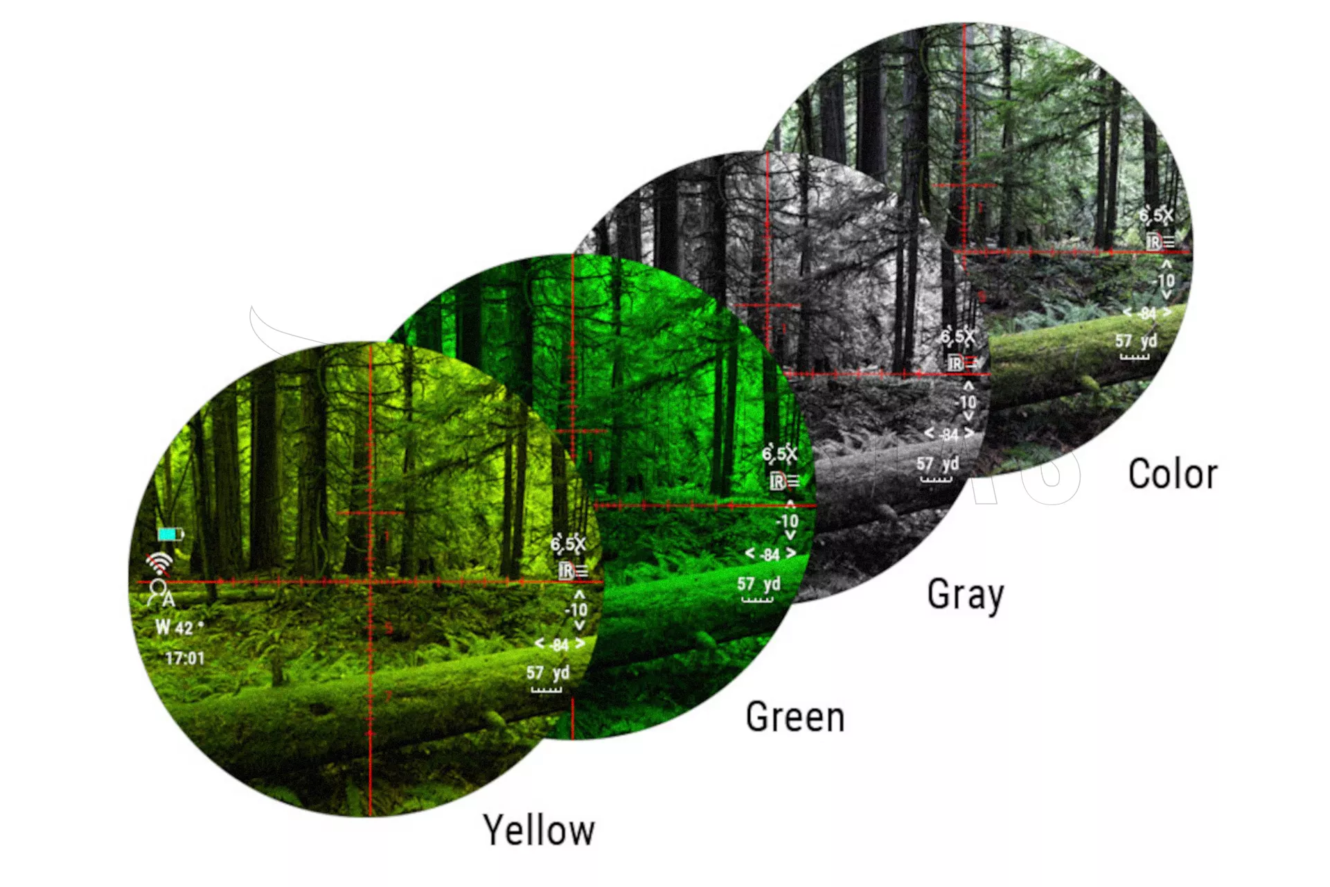 Das Nachtsichtgerät bietet insgesamt 4 Anzeigemodi - Farb-Tag-Modus, Schwarz-Weiß, Grün und Gelb. Außerdem kann man aus 6 Absehen in 4 Farben wählen, die für bis zu 5 Waffen genullt werden können. Das Absehen bewegt sich während des Nullstellens nicht. Stattdessen wird das gesamte Bild angepasst.