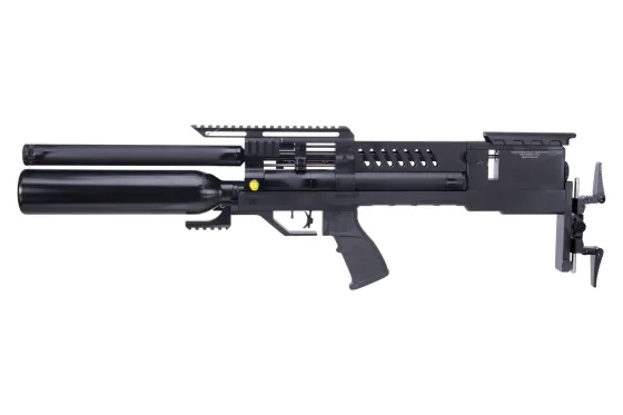 PCP-Pistole mit der Möglichkeit, innerhalb weniger Sekunden in ein Karabiner umzuwandeln. Sie zeichnet sich durch eine Polymerkonstruk­tion, 3 klappbare Visierungen, einen ergonomisch geformten Griff und ein abnehmbares Schaft mit höhenverstellbarer Wangenauflage aus.