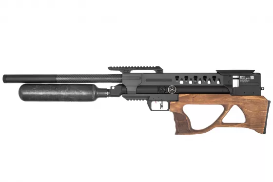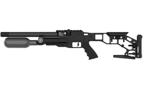 Überlegenes PCP-Luftgewehr für die Disziplin Field Target. Es verfügt über einen frei schwimmenden Lauf in Match-Qualität, der mit einem mikroverstellbaren Luftverteiler ausgestattet ist, eine Titanpatrone, einen polierten Laminatschaft mit voll verstellbarer Schaftkappe und Wange sowie eine verstellbare Laufschiene.