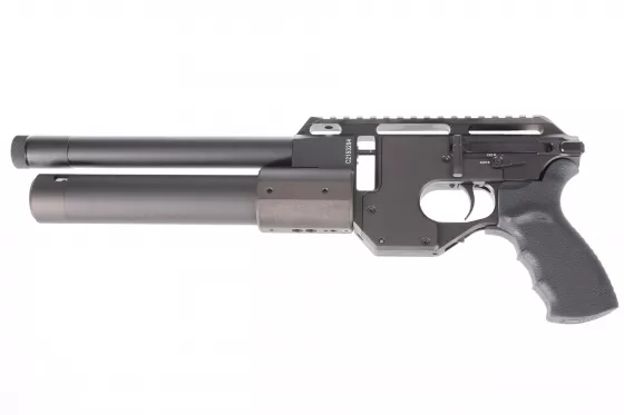 Der Lauf ist ummantelt und endet mit einem 1/2 UNF Gewinde, an dem auch ein externer Schalldämpfer angebracht werden kann. Manuelle Sicherung gegen unerwünschte Schüsse. Der Lufttank hat eine unglaubliche 500 cc Luftkapazität