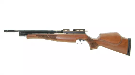 S510 Carbine ist eine neue Version des beliebten PCP-Luftgewehrs des britischen Herstellers Air Arms. Der schöne Nussbaumschaft ist mit einer Wangenerhöhung und einem Gummikolbenpolster zur Rückstoßdämpfung ausgestattet. Der Pistolengriff und der Vorderschaft sind geriffelt.