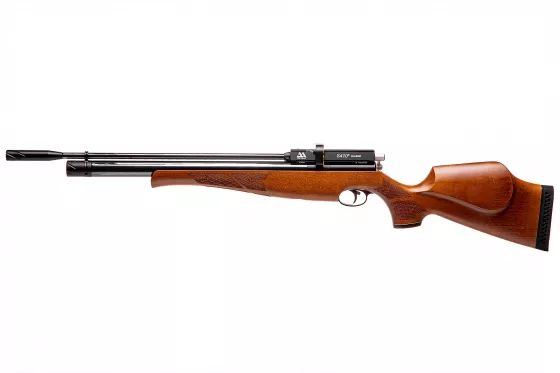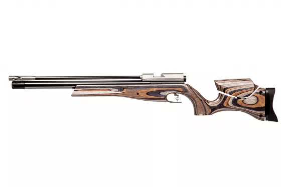 Einschüssiges PCP-Gewehr mit Lothar-Walther-Lauf, das sich durch perfekte Präzision auszeichnet. Hochwertige Verarbeitung, gekrönt mit schönem Holzschaft. Besonders geeignet für sportliche Zwecke.