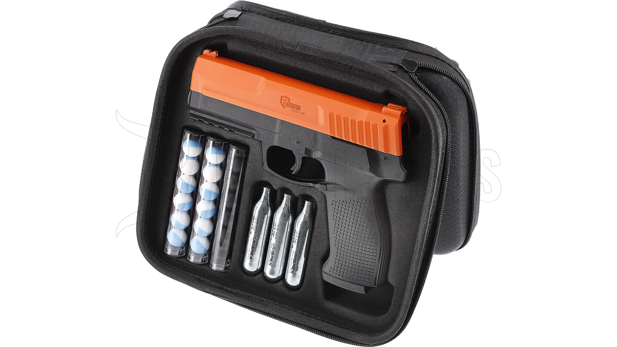 Das Modell Secure 68P wird mit allem geliefert, was Sie für den Schießbeginn benötigen. Neben der Pistole finden Sie im Lieferumfang 3 Stück 12g CO₂-Kapseln, 6 Stück Gummikugeln, 6 Stück Pfefferkugeln und 6 Stück Markierungskugeln. Das alles in einem mit Schaumstoff gepolsterten Etui mit Reißverschluss und Trageschlaufe.