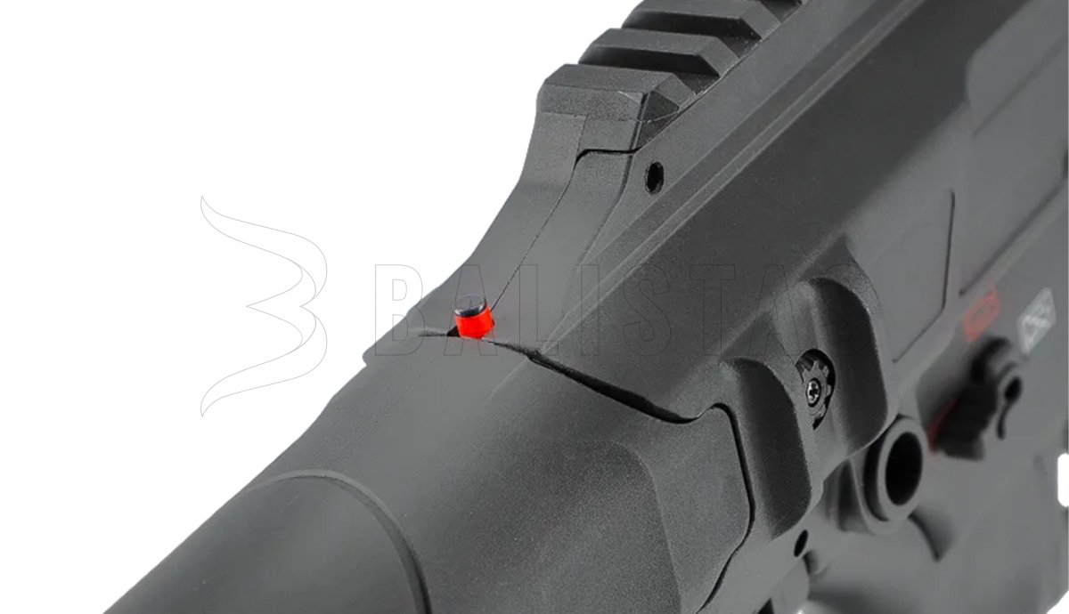 Eine willkommene Neuerung des Herstellers ist das Sicherheitsventil, das sich an der Vorderseite des Schaftes befindet. Damit können Sie das interne System der Waffe sicher entlüften, während die Patrone unter Druck steht. Wir raten zwar immer noch davon ab, die CO2-Patrone länger als nötig aktiviert zu lassen (gefrierendes Kohlendioxid kann die Dichtungsringe des Ventils mit der Zeit beschädigen), aber das Ventil ist bei Wartungsarbeiten oder kurzen Schießpausensehr praktisch. Und wenn Sie anstelle der CO2-Kapseln die bereits erwähnte HPA-Flasche verwenden, besteht keine Gefahr mehr, dass die Dichtung durch gefrierendes Gas beschädigt wird.