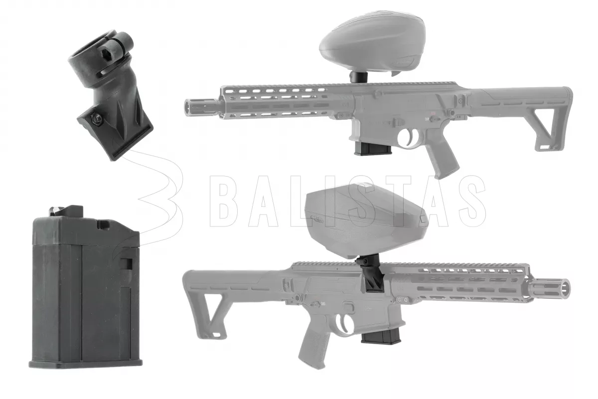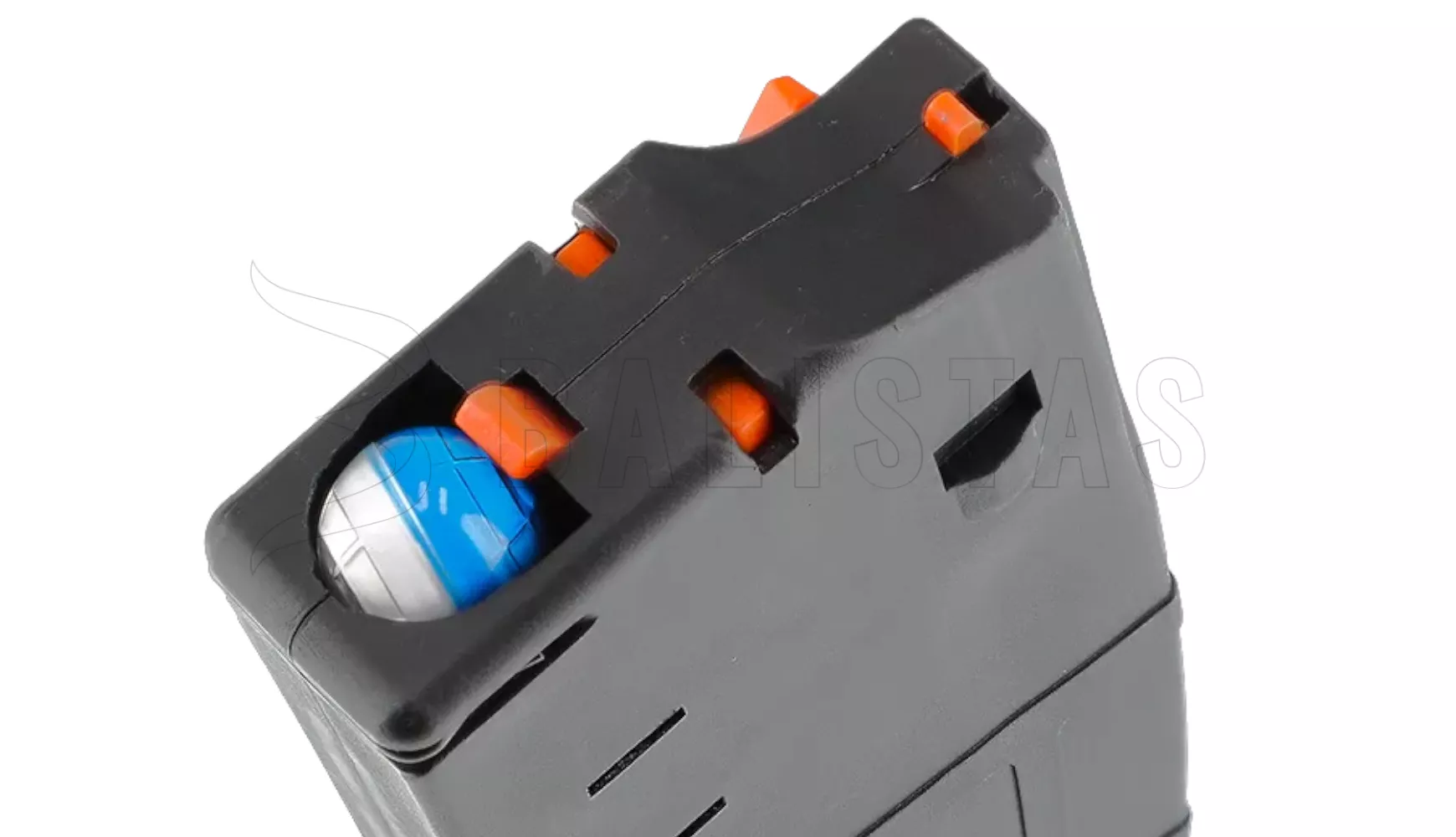 Als Munition kann praktisch jedes Gummi-, Paintball- oder Pfeffergeschoss im Kaliber .68 (17,27 mm) verwendet werden . Das untere 20-Schuss-Magazin ist sogar mit nicht-runden Präzisionsgeschossen kompatibel, um die Genauigkeit zu erhöhen. Wenn Sie Munition mit höherer Kapazität benötigen, kann der mitgelieferte Adapter verwendet werden, um jedes Paintball-Hopper-Magazin zu installieren. Eine "Dummy-Mag"-Magazinbodenkappe ist ebenfalls enthalten.