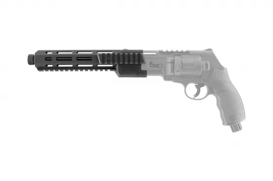 Laufbefestigung mit drei 22-mm-Picatinny-Schienen und M-LOK-Schlitzen zur Laufverlängerung von T4E HDR 50 und TR 50L Gummi- und Pfeffergeschos­srevolvern mit einem M17×1-Gewinde an der Mündung, das mit der T4E X-Tracer 50 Beleuchtun­gseinrichtung kompatibel ist.