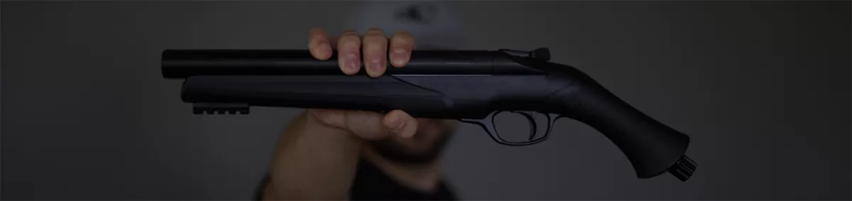 2. generation einer doppelläufigen Schrotflinte, die für eine wirksame, aber nicht tödliche Selbstverteidigung mit Gummi- und Pfeffergeschossen entwickelt wurde, die von einer 12 g CO2-Bombe angetrieben werden.