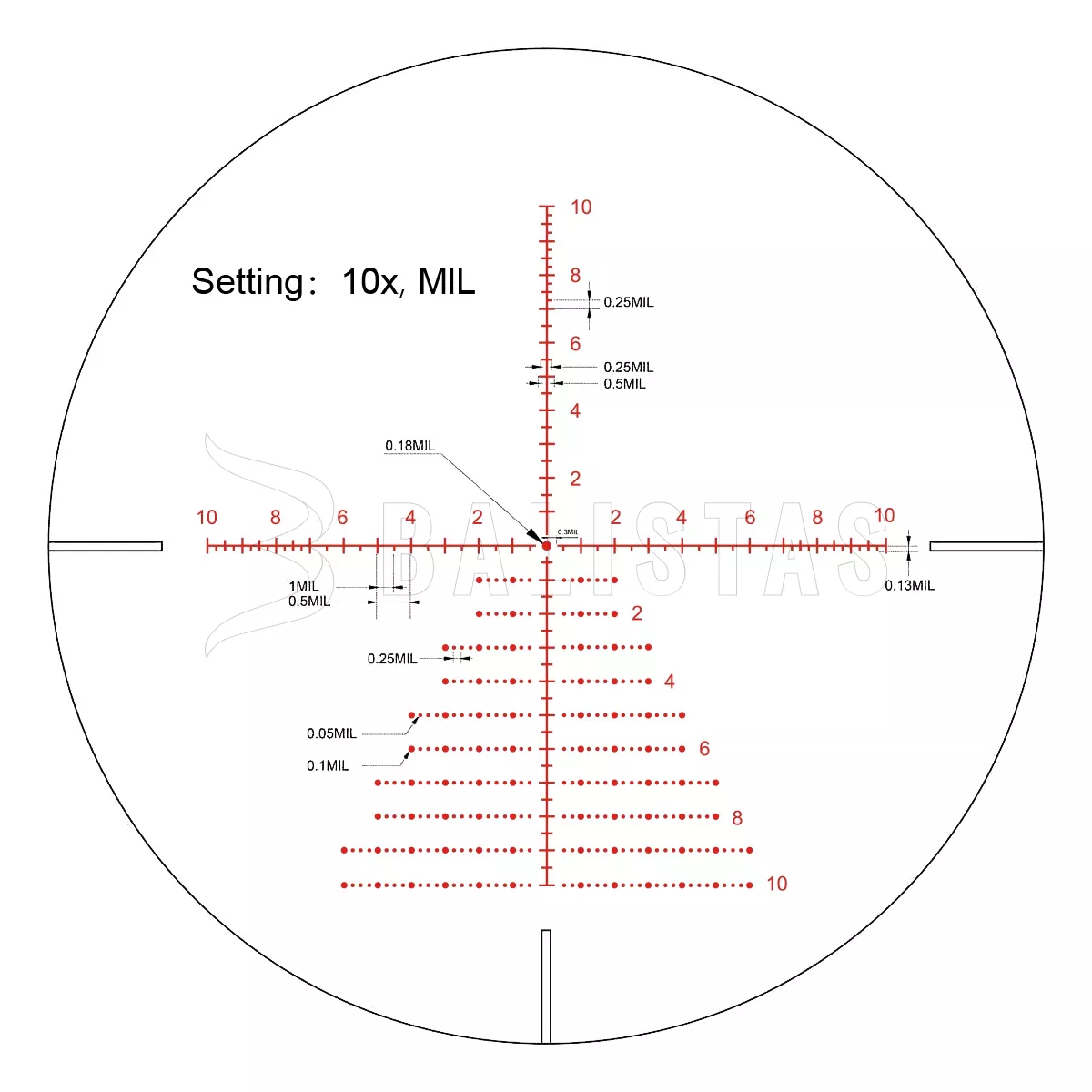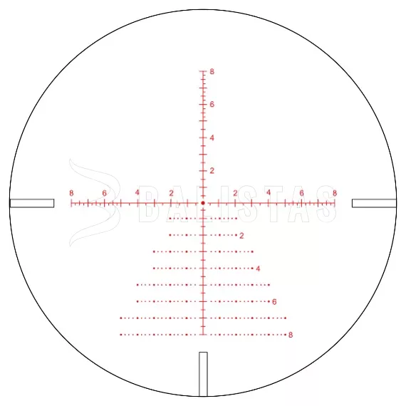 Der taktische Umriss des VCT-10A ist direkt in das Linsenglas geätzt und hält einem Rückstoß von bis zu 6000 J stand. Das Kreuz ist gut lesbar und befindet sich in der zweiten Brennebene, so dass die gewählte Vergrößerung keinen Einfluss auf seine Größe hat.