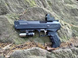Es besteht aus einer 6061-T6-Aluminiumlegierung in Luft- und Raumfahrtqualität und ist durch eine mattschwarze Oberfläche geschützt. Dadurch hält sie dem Rückstoß echter Schusswaffen stand - sie wurde mit Pistolen der Kaliber 9 mm und .45, 12-GA-Schrotflinten und Gewehren mit Lapua Magnum 338-Munition getestet. Außerdem müssen Sie sich dank der IPX6-Einstufung keine Sorgen machen, dass es nass wird.