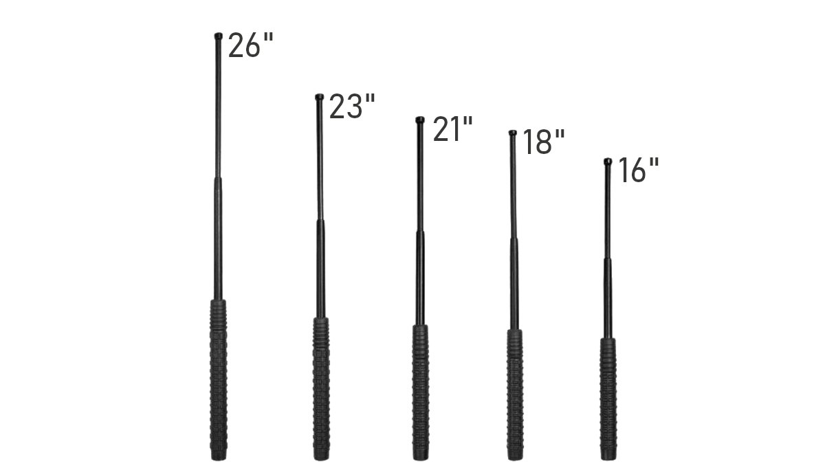 Sie denken wahrscheinlich: „Je länger, desto besser“. Das trifft aber bei Teleskopschlagstöcken nicht ganz zu. Ein sehr langer Schlagstock (z. B. 28") hat natürlich eine größere Reichweite, doch sein höheres Gewicht und Größe wirken sich negativ auf die Manövrierfähigkeit aus. Außerdem ist er nicht sehr handlich für den täglichen Gebrauch. Trotz der Möglichkeit, ihn einzuklappen, ist er immer noch ein recht großes und schweres Metallstück. Generell empfehlen wir eine Länge von etwa 18" bis 21", was einen guten Mittelweg zwischen Effektivität und Komfort darstellt.