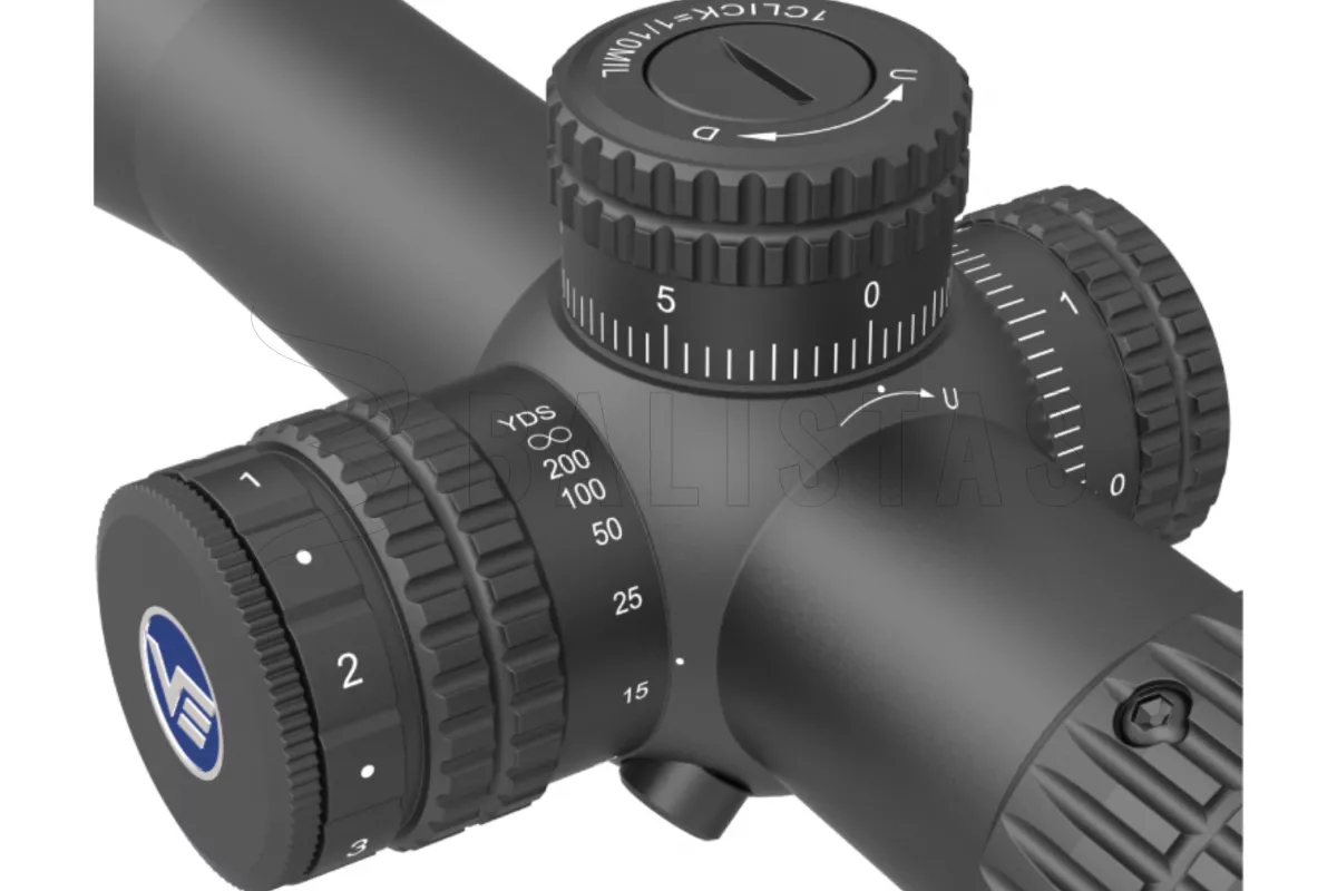Die horizontale und vertikale Einstellung des Kreuzes erfolgt über zwei offene Schornsteine mit Feststell- und Nullfunktion im Bereich von 14,5 MIL, wobei ein Klick 1/10 MIL (1 cm pro 100 m) entspricht.